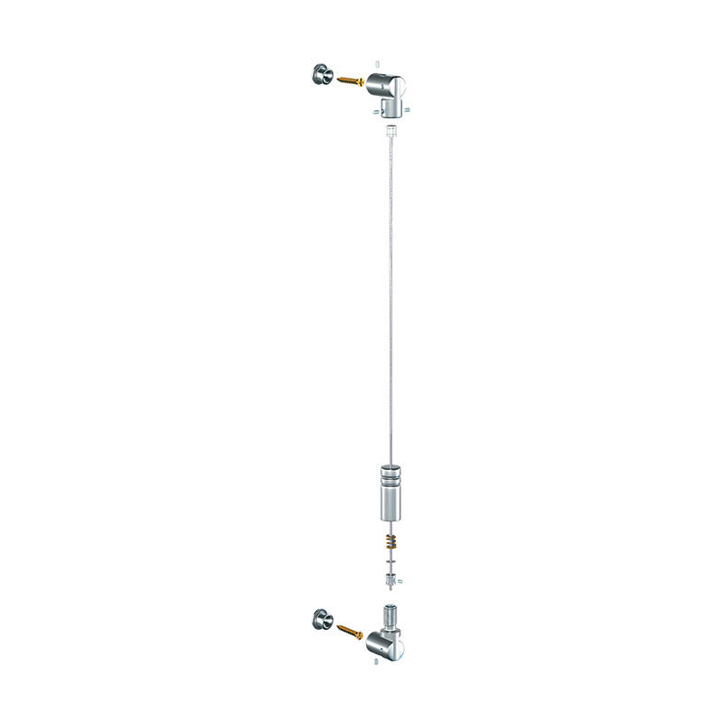 Le Kit Pivot Mur/Mur pour systèmes de câbles d’affichage suspendus est fabriqué en aluminium anodisé. Ces kits sont utilisés pour suspendre et afficher de nombreux articles.