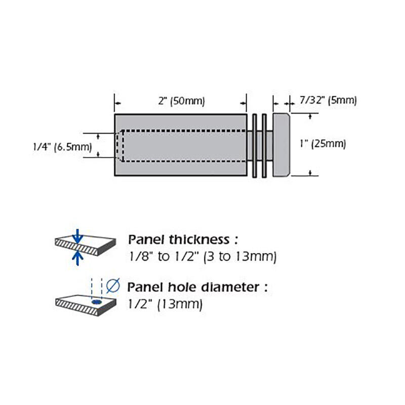 Les Entretoises Murales (Filetées) fournies par Mustang Systems sont fabriquées en aluminium avec une finition anodisé. La fixation murale vissée (entretoise) est livré avec 2 rondelles en silicone et idéale pour fixer un panneau de verre.