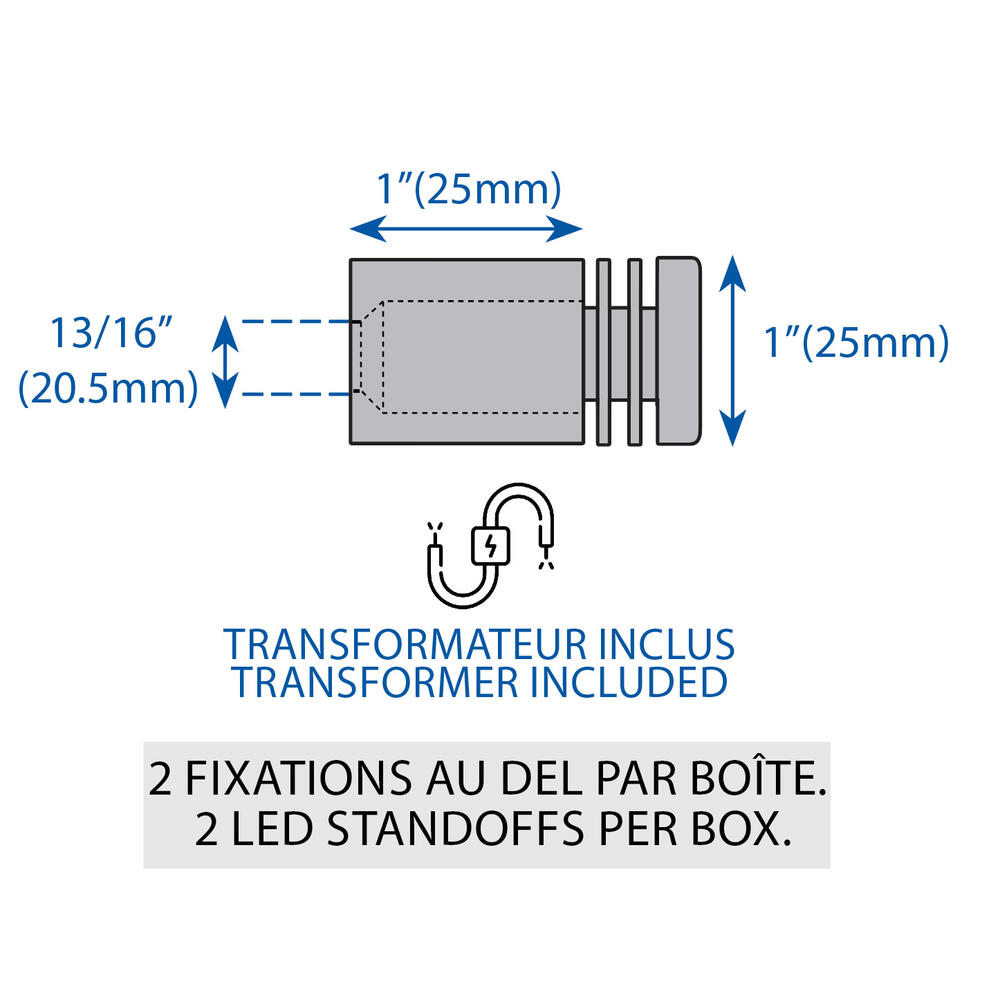Les Entretoises Murales LED fournies par Mustang Systems sont fabriquées en aluminium avec une finition anodisé. La fixation murale vissée (entretoise) est livré avec 2 rondelles en silicone et idéale pour fixer un panneau de verre.