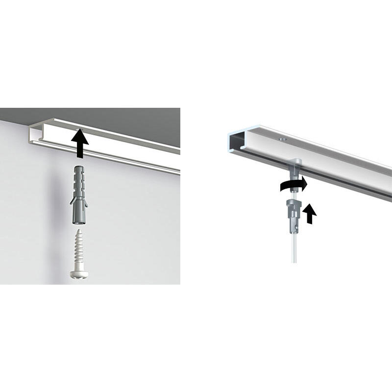 La Cimaise Top Rail (Aluminium Brossé) fourni par Mustang Systems est discret dans sa dimension et est un système de suspension idéal à utiliser en combinaison avec des plafonds encastrés.